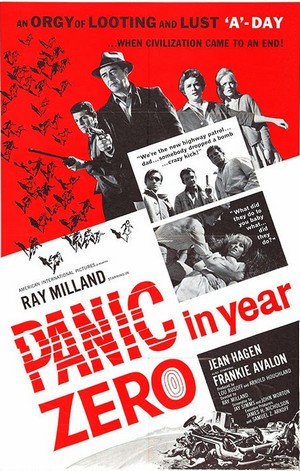Ray Milland both starred in and directed the morose, minimalist sci-fier Panic in the Year Zero! (original title: Panic in Year Zero!). En route from Los Angeles to a vacation in the mountains, Harry Baldwin (Milland), his wife, Ann (Jean Hagen), and his teen-aged children, Rick (Frankie Avalon) and Karen (Mary Mitchell), are appalled to see a mushroom cloud forming over the L.A. skyline. With the highways clogged by panicking motorists, Milland and his family decide to head to the shelter of their fishing spot, there to wait until more news about the nuclear disaster is available. Everywhere they drive, however, the family is confronted by rampaging looters, heavily armed survivalists, and doped-up motorcycle punks. Attempting to remain calm and collected in the face of Armageddon, Milland ends up as violent and animalistic as everyone else. Though it avoids proselytizing for the most part, Panic in the Year Zero! does fall back on the old reliable “The Beginning” fadeout title. The most powerful aspect of the film is the “normalcy” of Milland’s family: we are made to feel throughout that what happens to them could very well happen to us, and how then would we react?