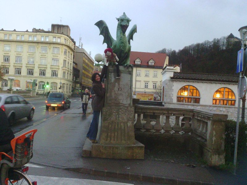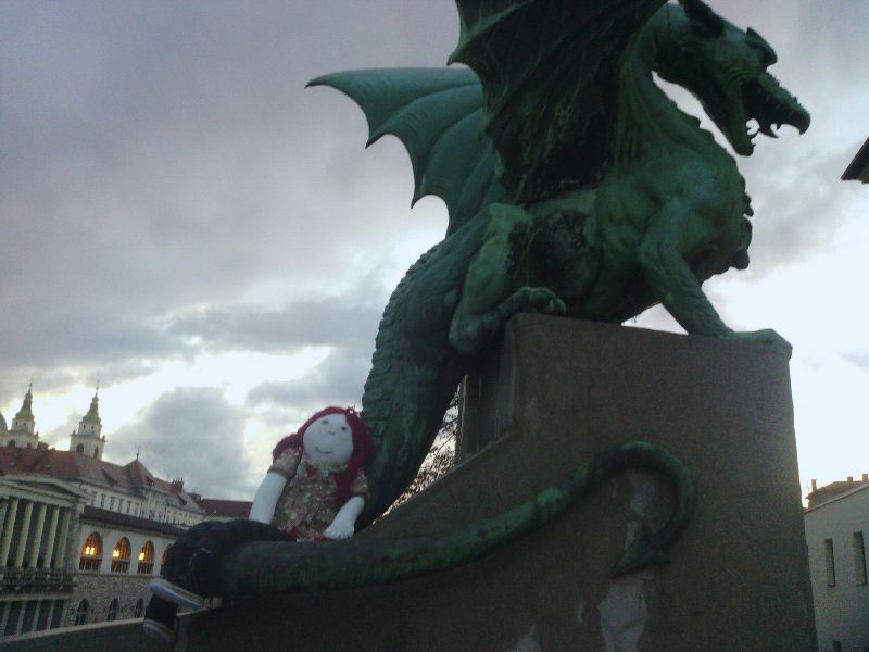 After going on a tour of Ljubljana Pippi learned that people long ago in Slovenia believed that a dragon protected the city. There is a famous bridge called Dragon Bridge and here is Pippi flying on the dragon!!